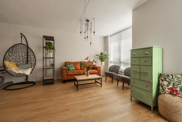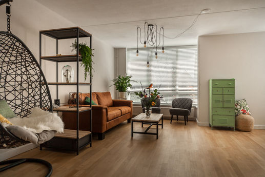 Door de smalle lange huiskamer zijn er meubels geadviseerd die in verhouding goed tot zijn recht komen binnen het geheel; de bank staat op pootjes zodat er meer 'lucht' rondom ontstaat. De fauteuiltjes zijn laag, zodat het zicht voor het raam niet volgebouwd wordt.